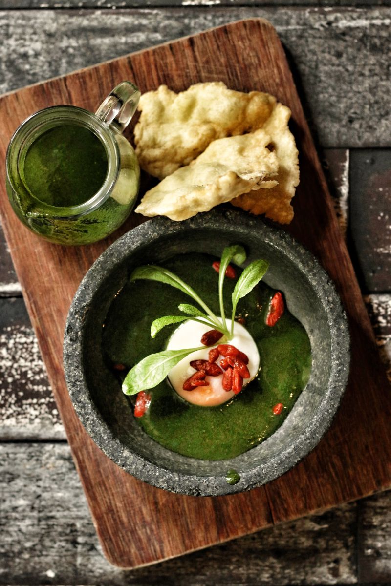 Open Door Policy 推出的新菜单就有多达15道100%无麸质与乳制品的菜肴,像西洋菜汤(Watercress Soup,$18),这款汤品灵感取自中式传统的西洋菜,师傅先将西洋菜榨成汁再混合排骨、枸杞子炖煮,上桌时加入水煮蛋,再配上自制无麸质面包,汤浓稠,面包外脆内软,很是开胃。