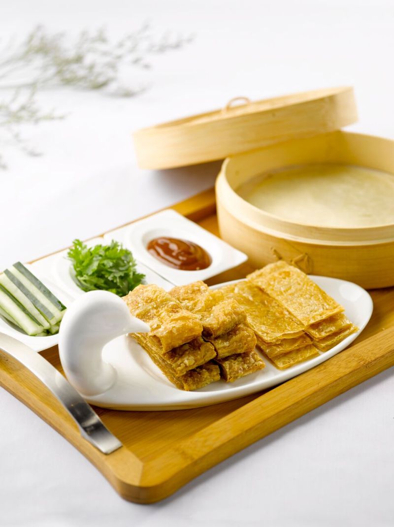 另一瞩目的是,宫廷素甲($24),灵感来自北京鸭,主料是素鹅和豆皮,两者煎至香脆,吃法有如吃北京鸭,将饼皮涂上一层甜面酱,再加入素鹅和豆皮、黄瓜条、芫荽卷起,口中呈现的是脆甜鲜。