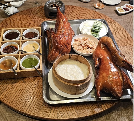 四川豆花饭庄推出全鸭宴(Peking Duck Buffet)中的北京鸭,就精选介于2.5公斤至2.8公斤的马来西亚农场养殖鸭,没有太多脂肪的鸭,经烧烤,外皮油亮酥香肉嫩,配搭6种搭配酱料(北京鸭酱、四川香辣酱、酸梅酱、日式芥末酱、韩国辣椒酱和泰式风味酱),餐馆还特地为食客准备了炸腐皮,和鸭皮、葱段、黄瓜段配合酱料裹在热腾腾的面皮,放进口中咔嚓咔嚓作响,增添了口感。