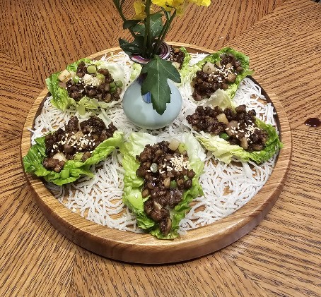 黑松露炒鸭松生菜盏,鸭肉切丁加入黑松露油爆炒,再用叶片面积较小的西洋生菜装盛,细咬慢嚼,口腔满满的黑松露香。