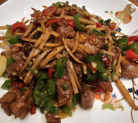 子姜鸭丁,红青辣椒切细条,配着花椒爆炒鸭丁,带微麻和鲜辣,但又不失口感。