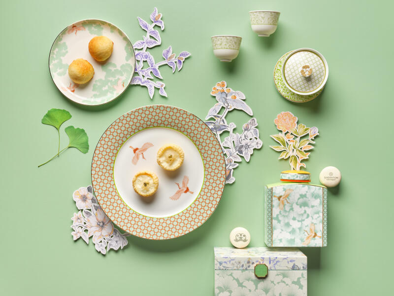 下午茶的甜品,包括椰子蛋糕、蛋泡芙、燕窝炖雪梨、绿冻糕、黑蒜酥皮饼和山楂糕等。