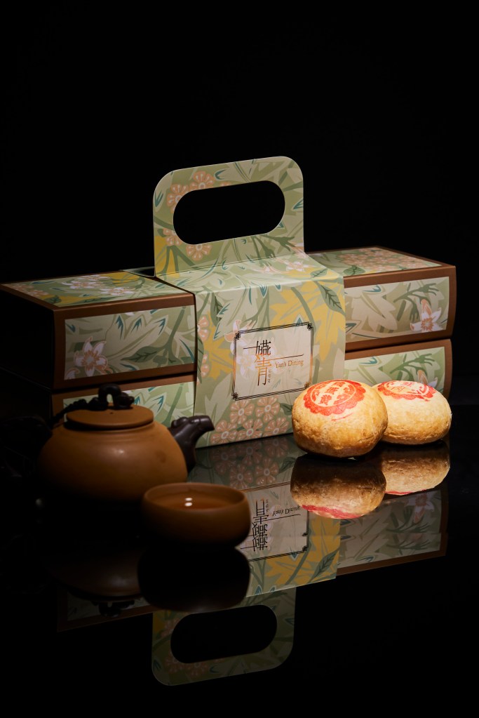 餐馆的烘皮月饼推出两种新口味,黑金蜜桃龙井冲绳黑糖麻糬,以及有花果茶香的蜜桃龙井搭配冲绳黑糖麻薯;不得不提,灵感来自童年怀旧鸡仔的绿豆红豆蓉月饼.