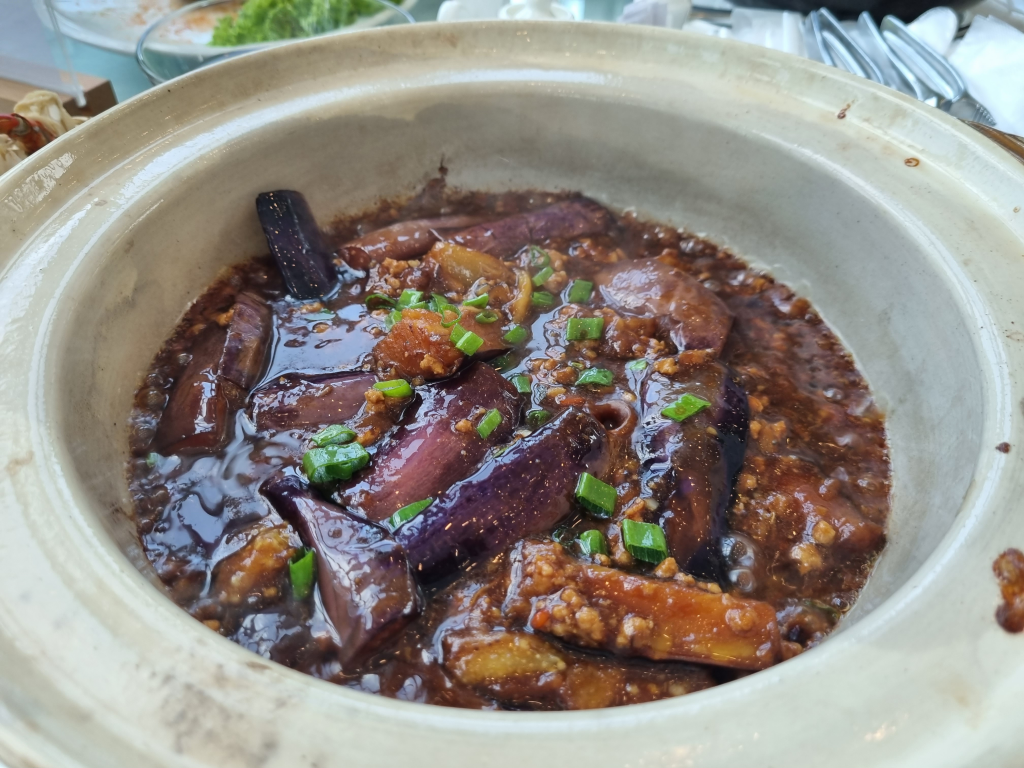 鱼香茄子煲,鱼香茄子是四川菜,据说原本没有鱼,后为增加其口感才加入咸鱼粒。这里的鱼香茄子煲以自制酱汁烹制,口感润滑、茄子吸入了满满的酱汁,鲜味四溢。