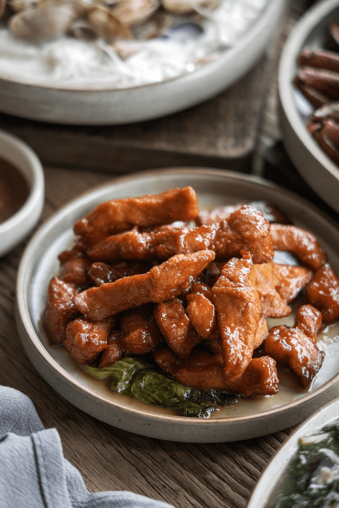 酥脆炸肉片炒菇,配上特别酱汁的肉片,炸至金黄色,酥酥脆脆。
