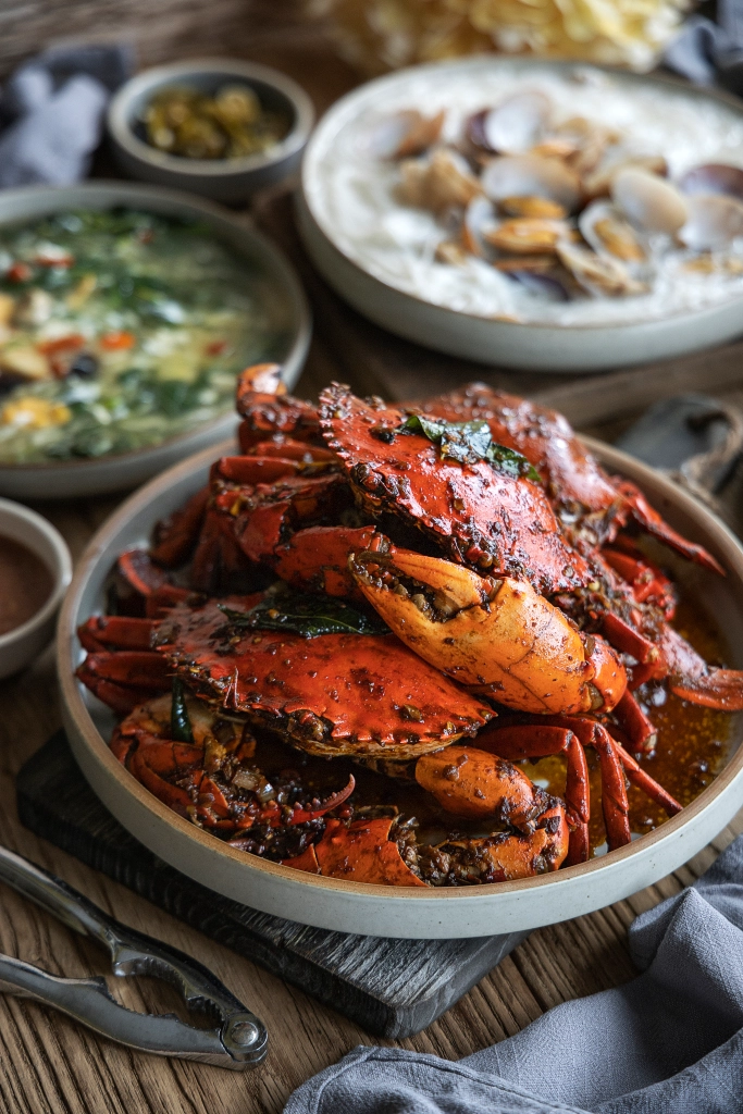 试菜吃了四种风味的螃蟹,虽然我不太能吃辣,但总爱甘香螃蟹的甘香带来的惊喜,采用虾米、指天椒、咖喱粉、豆瓣酱、香茅、蒜头和小葱头等调制而成的甘香酱汁,与螃蟹下锅炒,有别于以咖喱粉烹制的浓郁口味,加入了豆瓣酱,其咸香中和了螃蟹的辣,也提升了层次感。