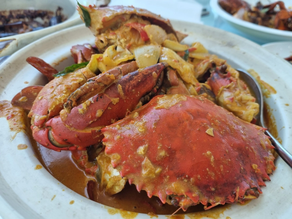 咖喱螃蟹源自咖喱鱼头,以螃蟹取代鱼头,汤汁也搭配了一些蔬菜,如茄子、包菜等,汤汁浓而不腻,蟹肉鲜甜肥美。