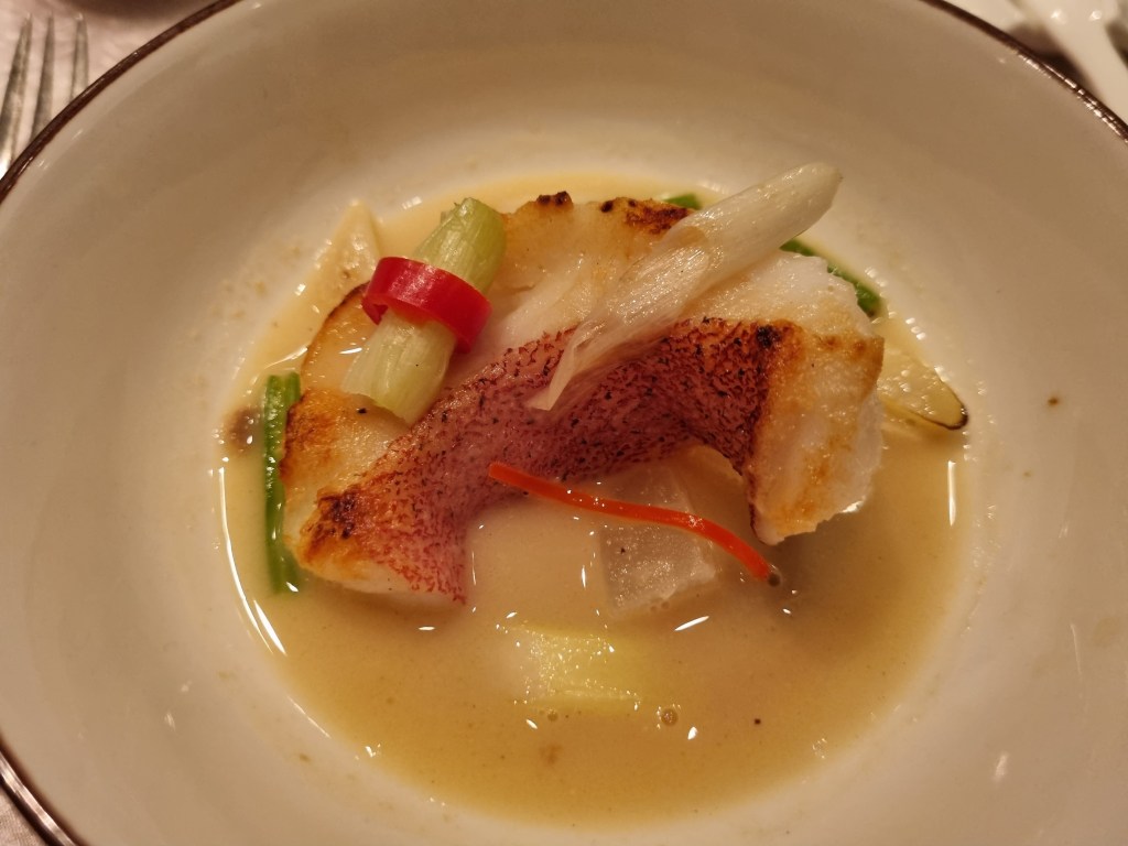 我选择笋壳鱼和以干贝、鲑鱼头、鱼骨和老母鸡等煨煮超过6小时的胶原蛋白浓鱼汤;鱼汤馥郁,有着满满的胶原蛋白,鱼肉更是Q滑。