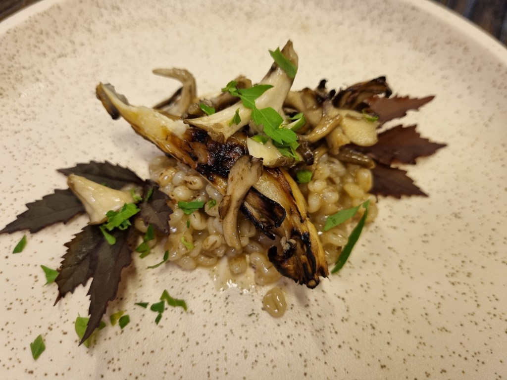 烤舞茸菇配焦香意式烩饭,垫在舞茸菇(Maitake Mushroom)底下的不是意式烩饭(Risotto),也不是白米饭,而是经过微炸的大麦米粒,增添菜的口感。