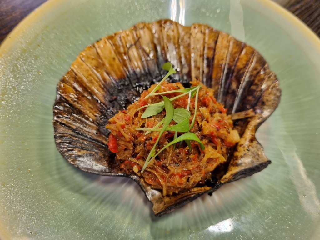 苏格兰帝王扇贝佐XO辣椒酱,扇贝铺上特制XO酱,扇贝沾上浓郁微辣的XO酱,鲜气分烈,吸香啜芳。