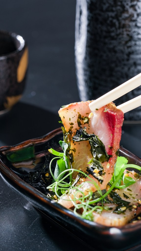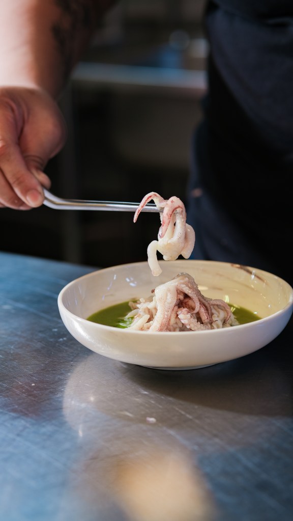 墨鱼面条,墨鱼切条状成面条,搭配青酱与黑橄榄,再经烟熏,墨鱼细软鲜滑,带有些许的烟熏香。