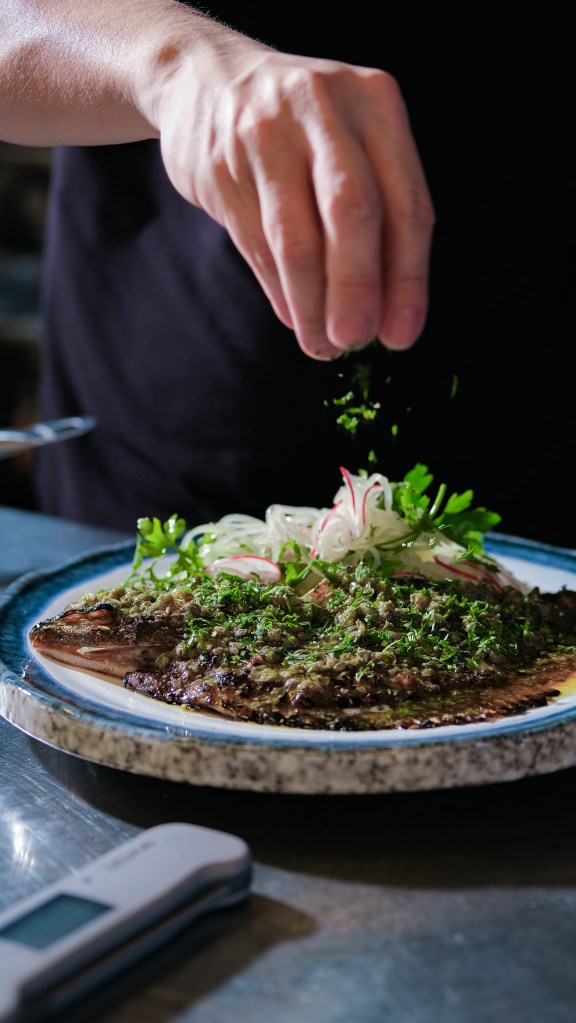 烧烤多宝鱼配蒜香黄油、腌渍木瓜及酸豆,以蒜香牛油搭配酸豆,再经木炭微烤,酥脆的鱼皮带有焦香,肉质丰腴细嫩。