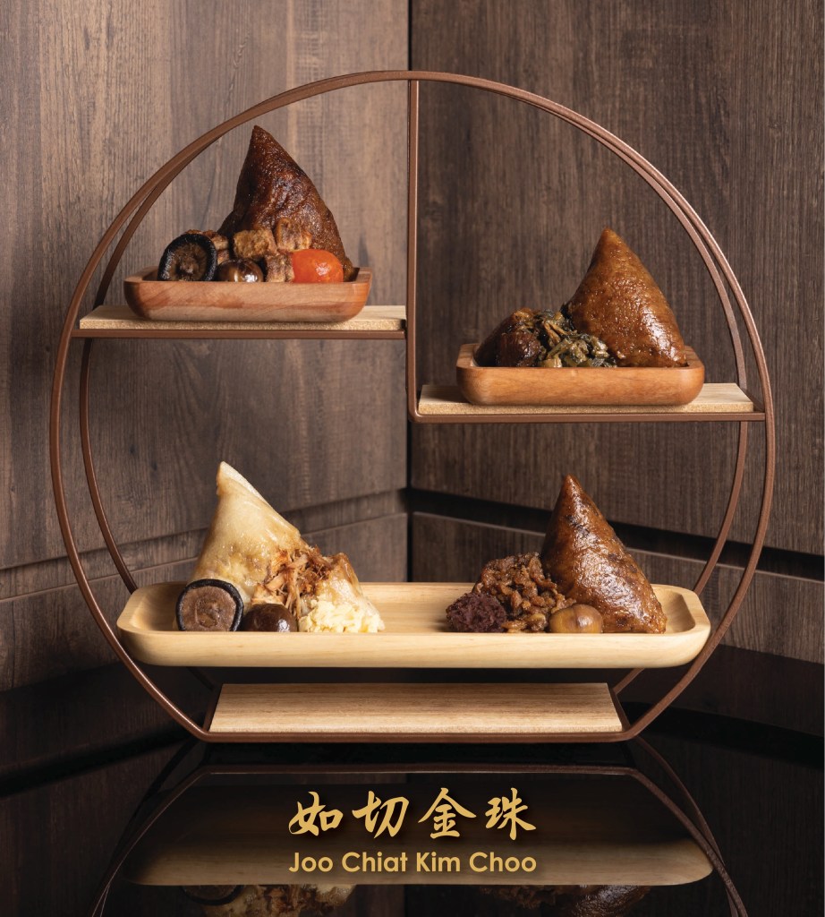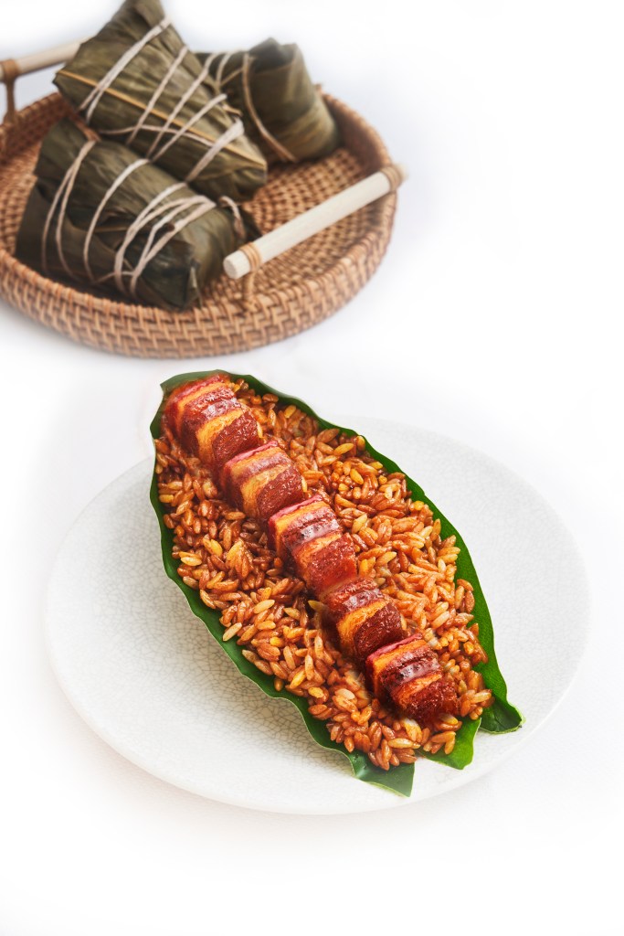 新加坡滨海湾宾乐雅臻选酒店(PARKROYAL COLLECTION Marina Bay)中餐馆鸿桃轩主厨钟腱腾和团队精心打造限量推出的家传五香黑豚南乳粽(Traditional Five Spices Kurobuta Pork Belly Rice Dumpling,$35.80),黑豚肉搭配香菇、栗子、虾米、咸蛋黄与腐乳,浓郁香气口中散发。