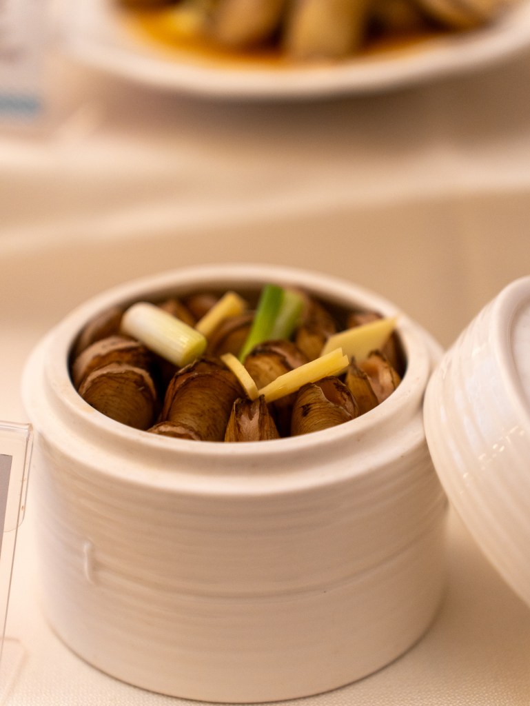 雅阁:新旧融合 推出9款新春堂食菜单,价格从每人$98.00++至10人的$2488.00++。 心水的年菜有花胶鸡翅鲍翅炖鸡汤,高汤香气四溢,每口都有层次感,鸡肉和鲍翅嫩滑;熏草本香草爱尔兰“琵琶”鸭,经过168小时的干式熟成,再以24小时的香料腌制,经烤制与熏制,外皮酥脆肉嫩滑多汁;花菇炖五头鲍与猪蹄,猪蹄四小时慢炖,吸收香料与草药的精华,猪蹄滑溜,汤汁回甘;其他包括炒澳洲龙虾配白芦笋、北海道牛奶、松露油及松子;脆皮软壳蟹配双米线与蟹黄等。